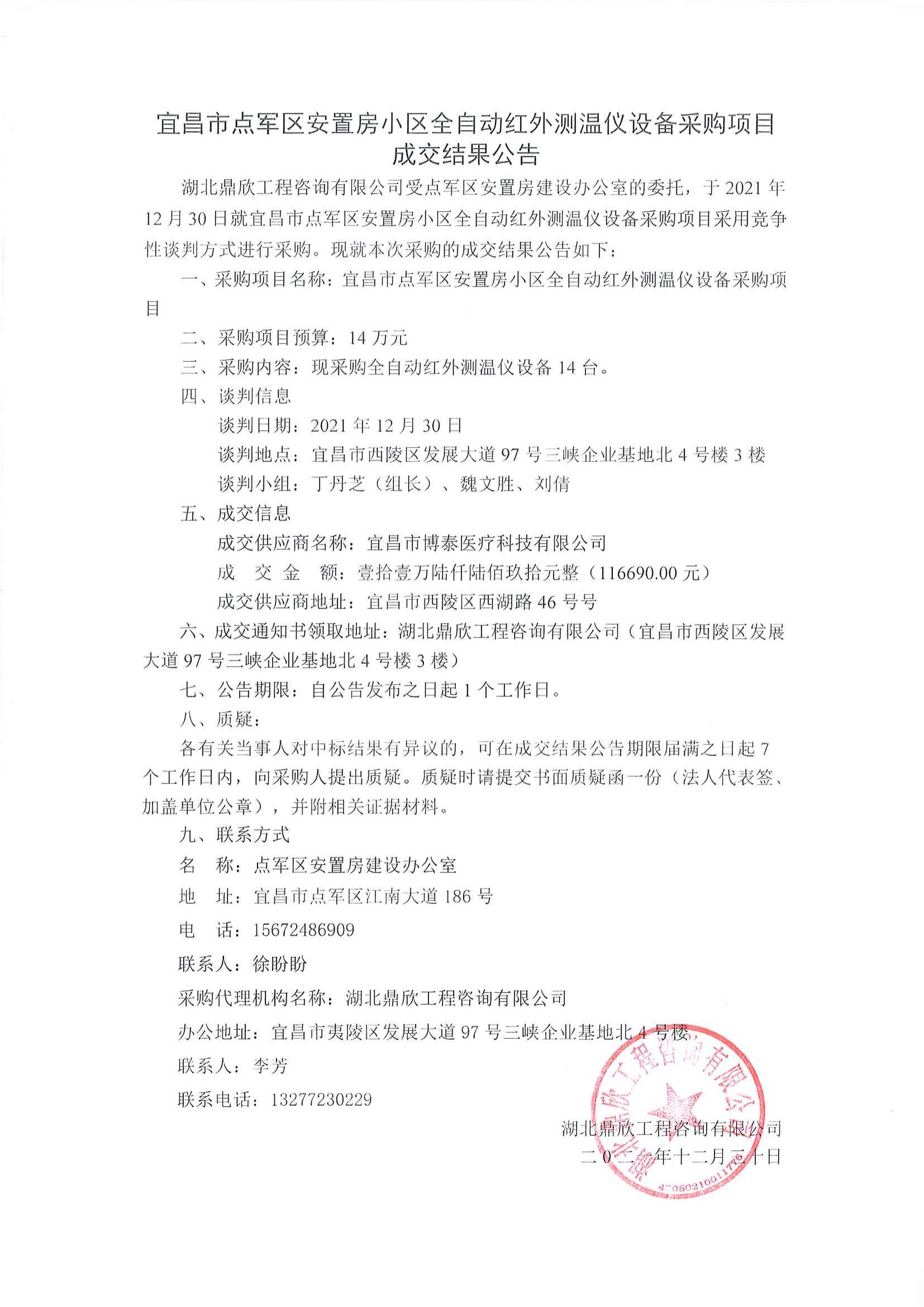 宜昌市點軍區(qū)安置房小區(qū)全自動紅外測溫儀設(shè)備采購項目成交公告