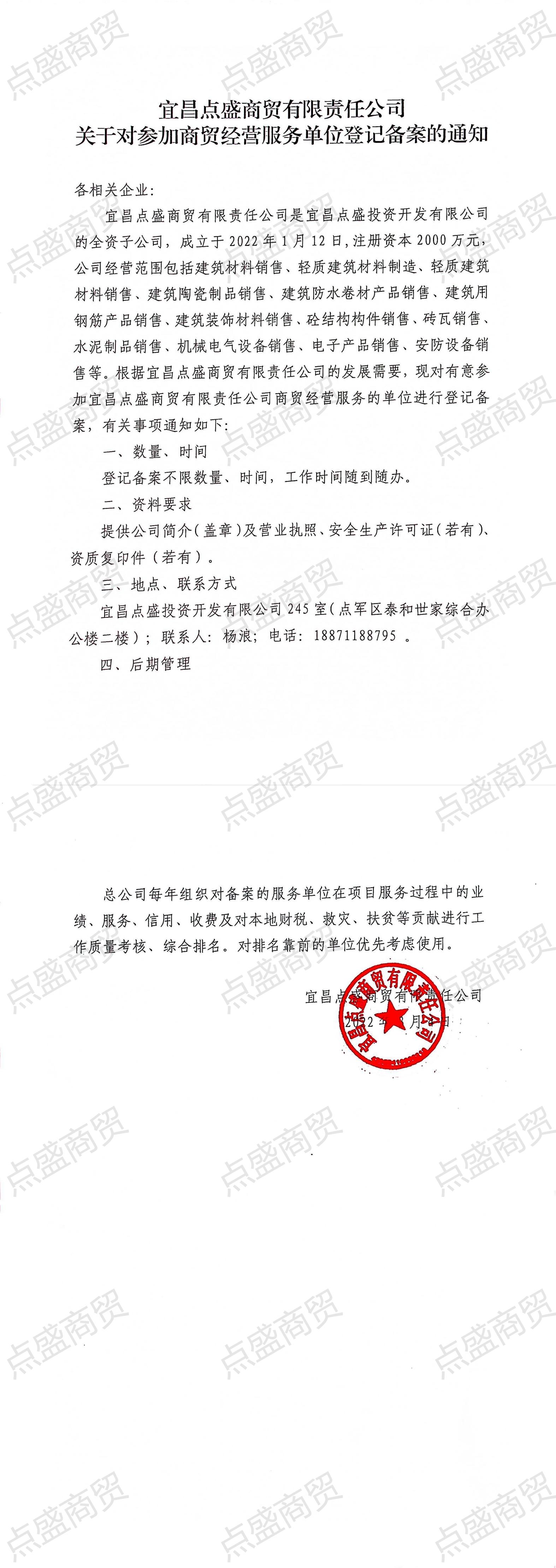 宜昌點盛商貿(mào)有限責(zé)任公司關(guān)于對參加商貿(mào)經(jīng)營服務(wù)單位登記備案的通知