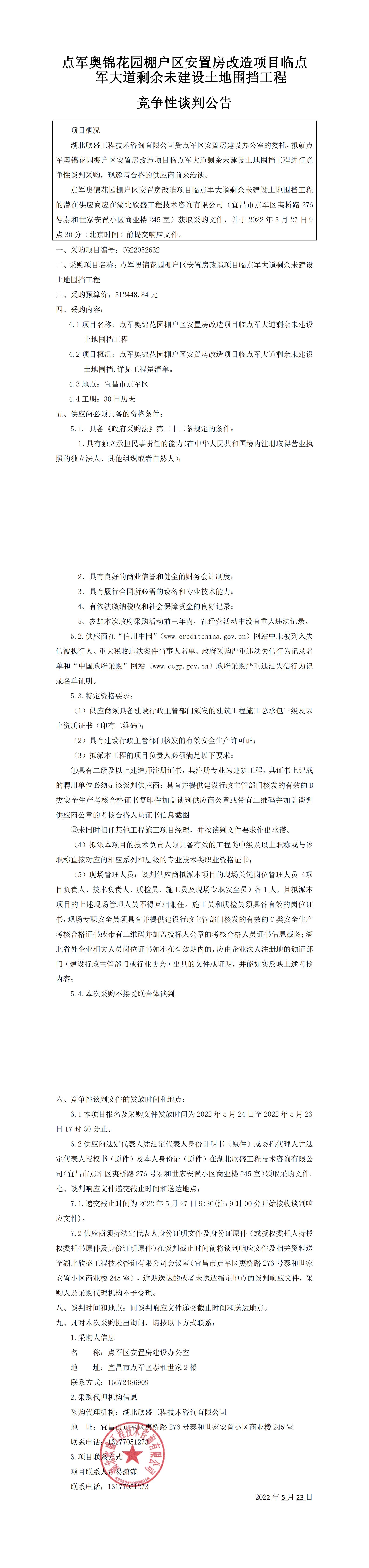 點軍奧錦花園棚戶區(qū)安置房改造項目臨點軍大道剩余未建設(shè)土地圍擋工程競爭性談判公告