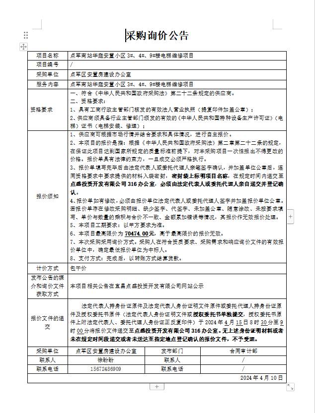 點(diǎn)軍南站華庭安置小區(qū)3#、4#、9#樓電梯維修項(xiàng)目詢(xún)價(jià)公告