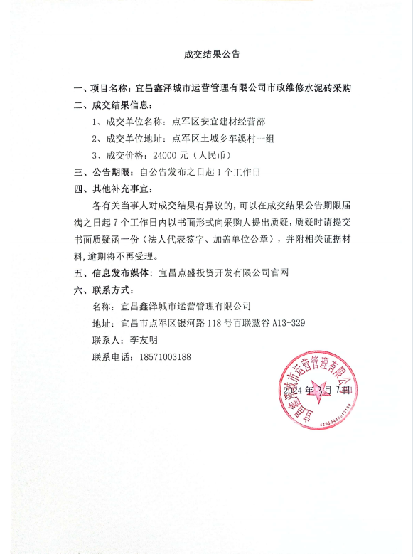 宜昌鑫澤城市運(yùn)營(yíng)管理有限公司市政維修水泥磚采購(gòu)項(xiàng)目成交公告