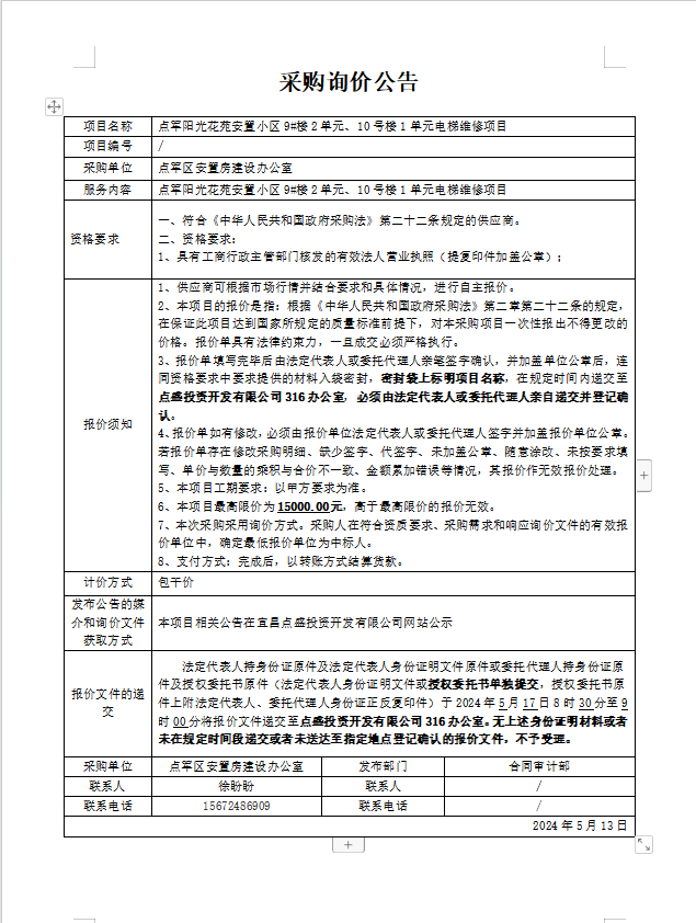 點(diǎn)軍陽(yáng)光花苑安置小區(qū)9#樓2單元、10號(hào)樓1單元電梯維修項(xiàng)目詢(xún)價(jià)公告
