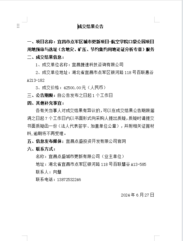 宜昌市點(diǎn)軍區(qū)城市更新項(xiàng)目-航空學(xué)院口袋公園項(xiàng)目用地預(yù)審與選址(含地災(zāi)、礦壓、節(jié)約集約用地論證分析專章)服務(wù) 成交公告