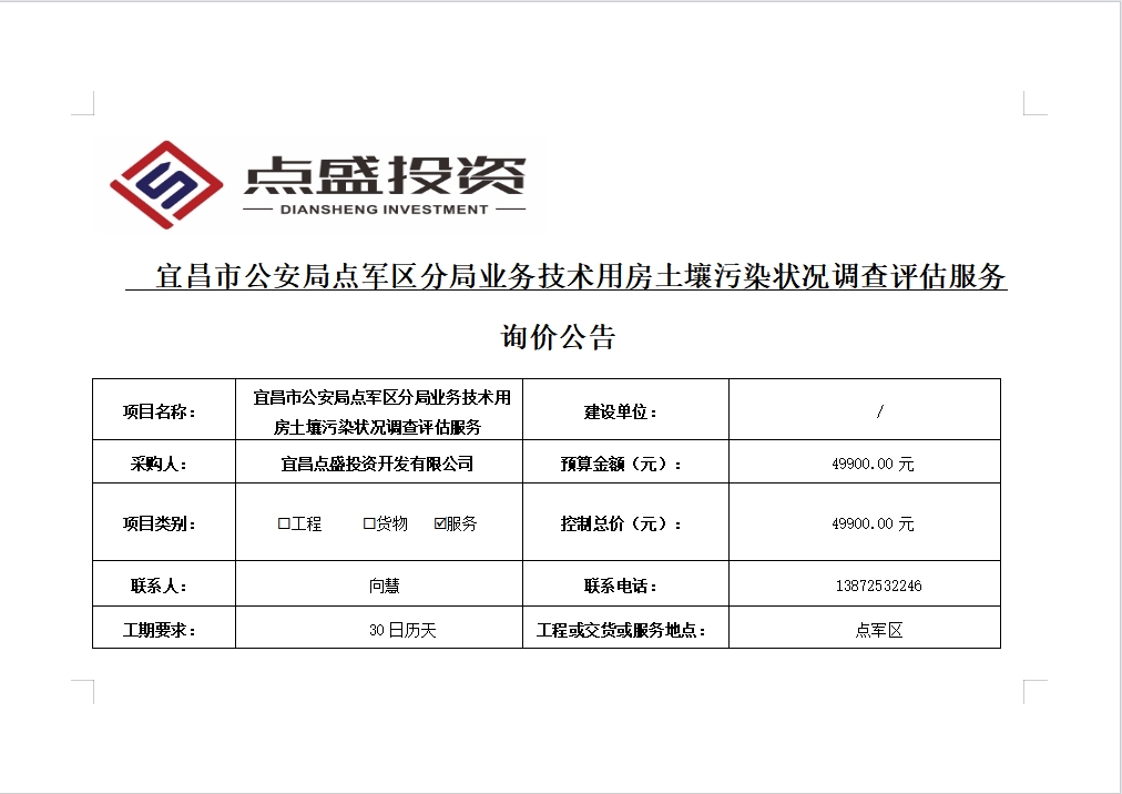 宜昌市公安局點(diǎn)軍區(qū)分局業(yè)務(wù)技術(shù)用房土壤污染狀況調(diào)查評(píng)估服務(wù)詢價(jià)公告