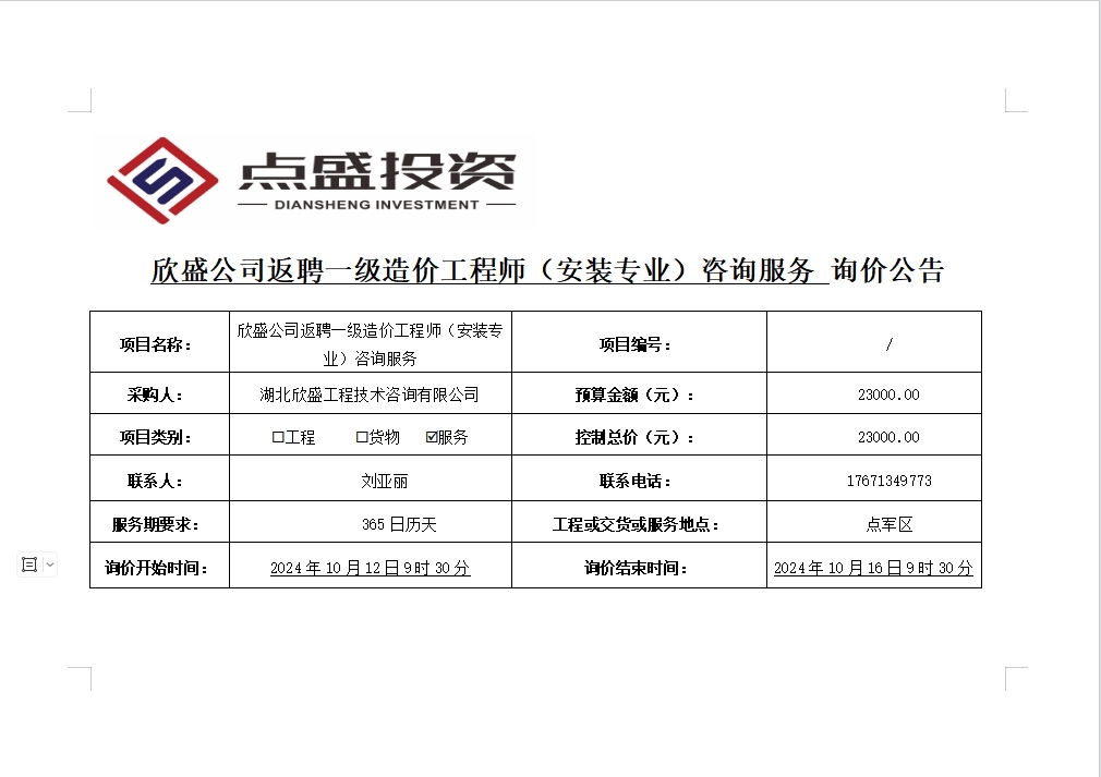 欣盛公司返聘一級造價(jià)工程師(安裝專業(yè))咨詢服務(wù)詢價(jià)公告