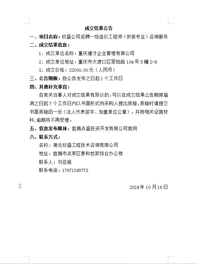欣盛公司返聘一級(jí)造價(jià)工程師(安裝專業(yè))咨詢服務(wù)成交公告