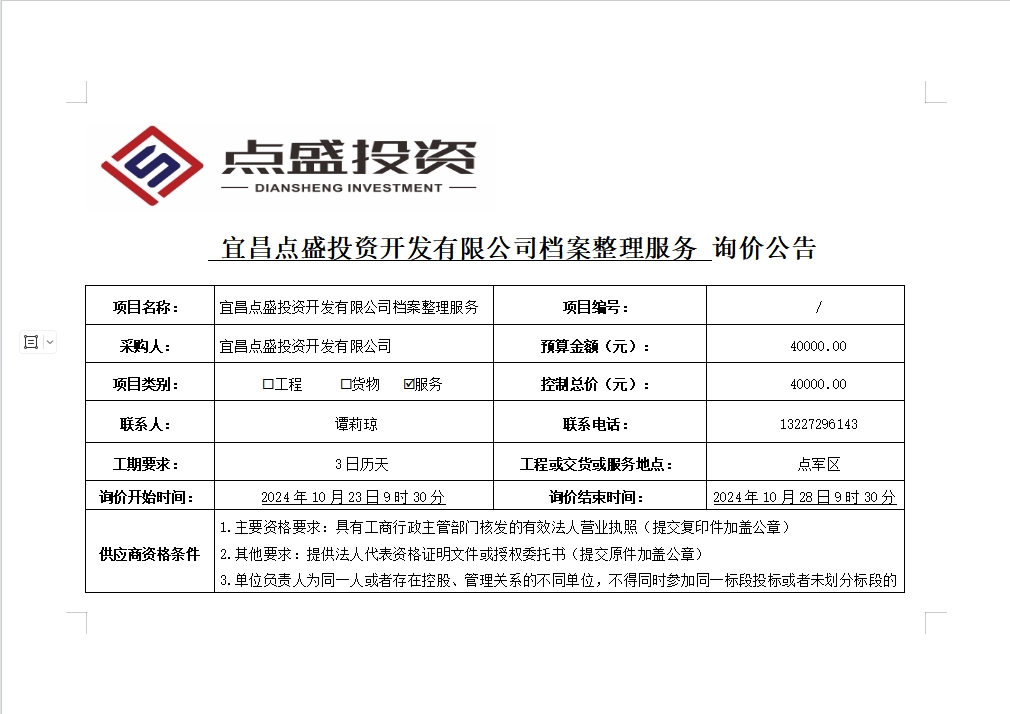 宜昌點盛投資開發(fā)有限公司檔案整理服務詢價公告