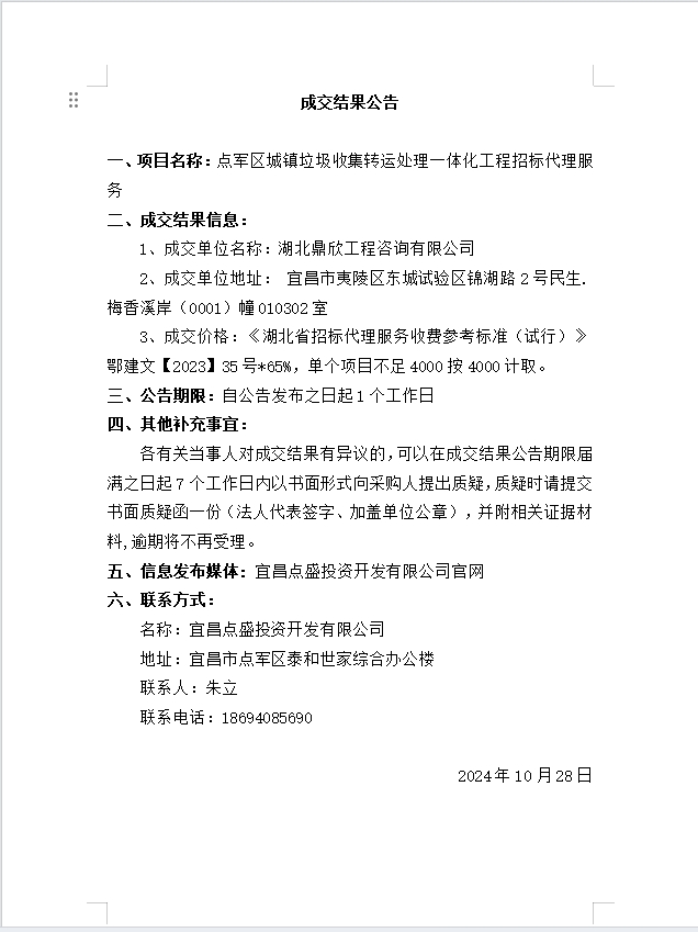 點軍區(qū)城鎮(zhèn)垃圾收集轉(zhuǎn)運處理一體化工程 招標代理服務(wù)成交公告