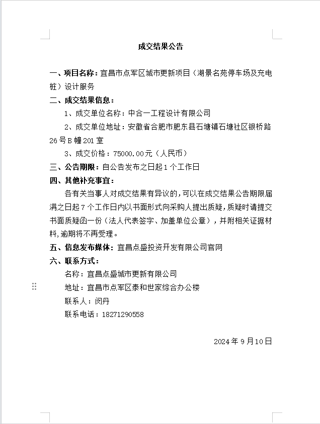 宜昌市點(diǎn)軍區(qū)城市更新項(xiàng)目(湖景名苑停車場及充電樁)設(shè)計服務(wù)成交公告
